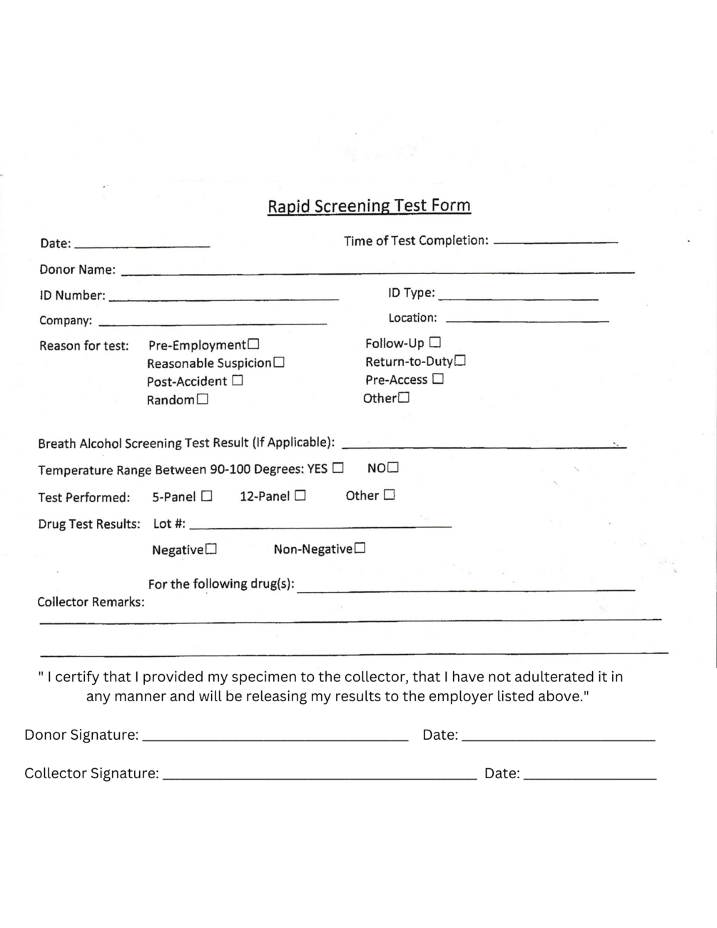 Use this Rapid Screening Test Form for all your instant rapid tests in office or onsite for your drug testing collection business. You can edit this form to add your company name and logo.